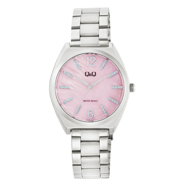 Caja de 34mm con acabado plata. Correa de metal, sumergible hasta 3 BAR (30 metros). Diseño sobrio y funcional. esfera rosada.